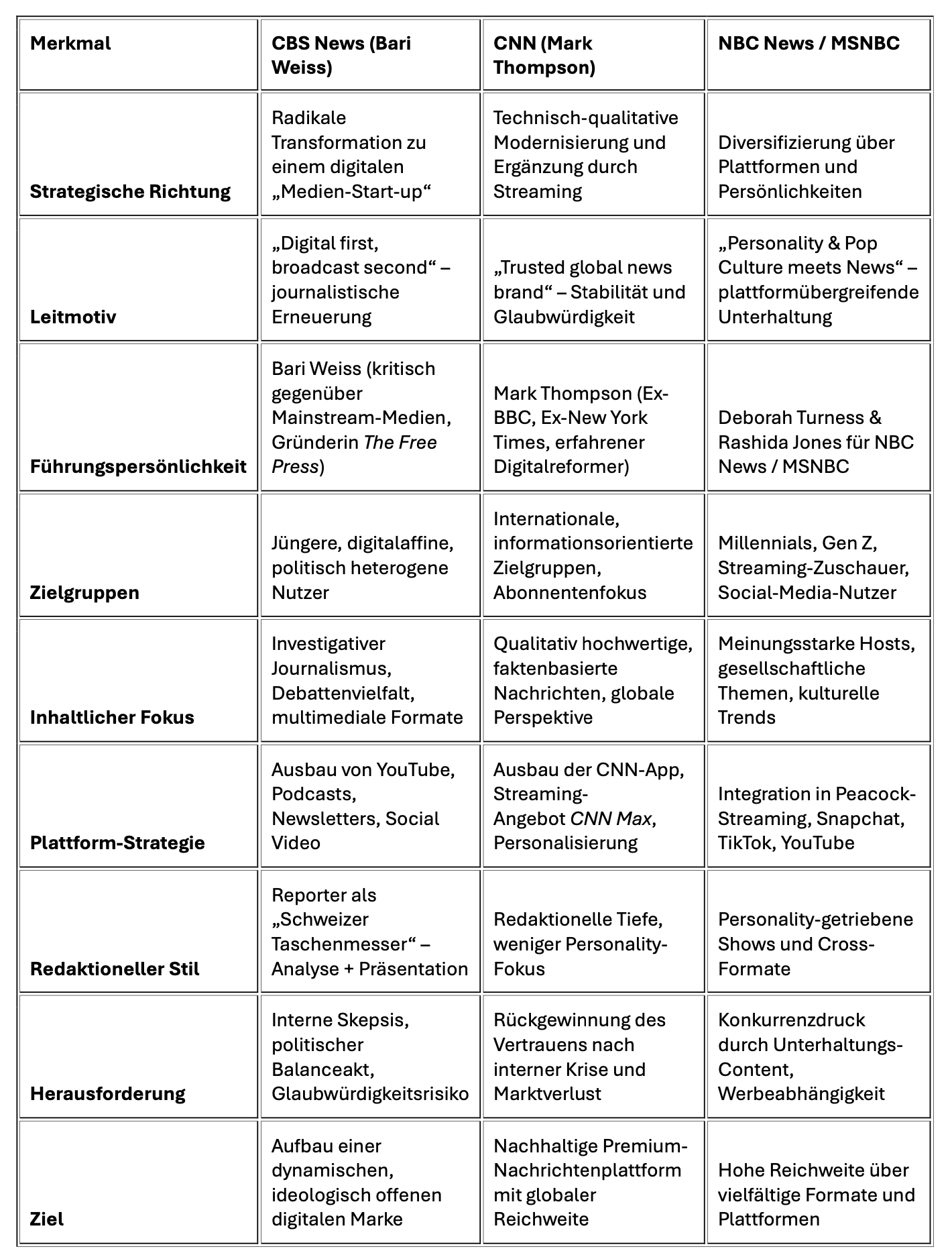 Die Reaktionen der drei großen Nachrichtenorganisationen CBS, CNN und NBC auf diese Transformation folgen unterschiedlichen institutionellen Logiken – und offenbaren dabei jeweils spezifische Annahmen über Zukunftsfähigkeit im Mediensektor.