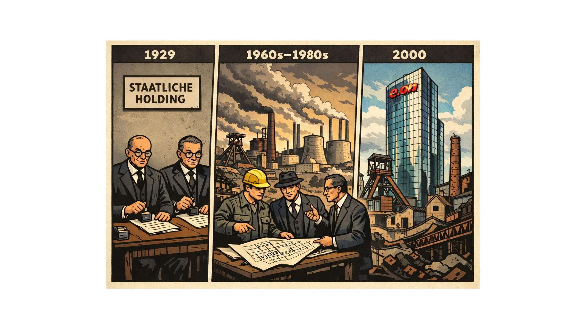 Ein analytischer Kommentar zu Heiner Radzios Unternehmensgeschichte der VEBA – über Pfadabhängigkeiten, stille Quersubventionierung, institutionelle Resilienz und das Ende eines Konglomerats, das seiner eigenen Gründungslogik nie ganz entkam. Und über einen letzten Wandel: Mit der Fusion zur E.ON AG im Jahr 2000 wurde aus der preußischen Verlegenheitslösung die Keimzelle eines der größten europäischen Energiekonzerne.