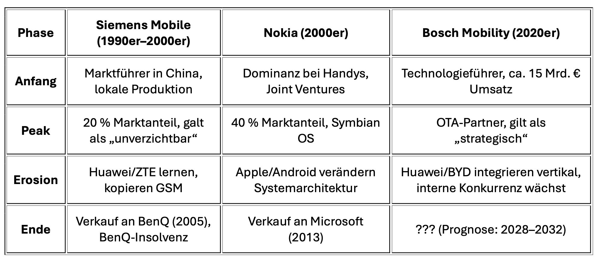 Diese Umkehrung ist irreversibel, denn chinesische OEMs bauen systematisch die Kompetenz auf, auch die Komponenten selbst zu fertigen (Beispiel: BYDs Halbleiter-Tochter, Huaweis Chip-Designs). Bosch wird zur Übergangslösung – profitabel, solange chinesische Player noch Komplexität auslagern, obsolet sobald sie es nicht mehr tun.