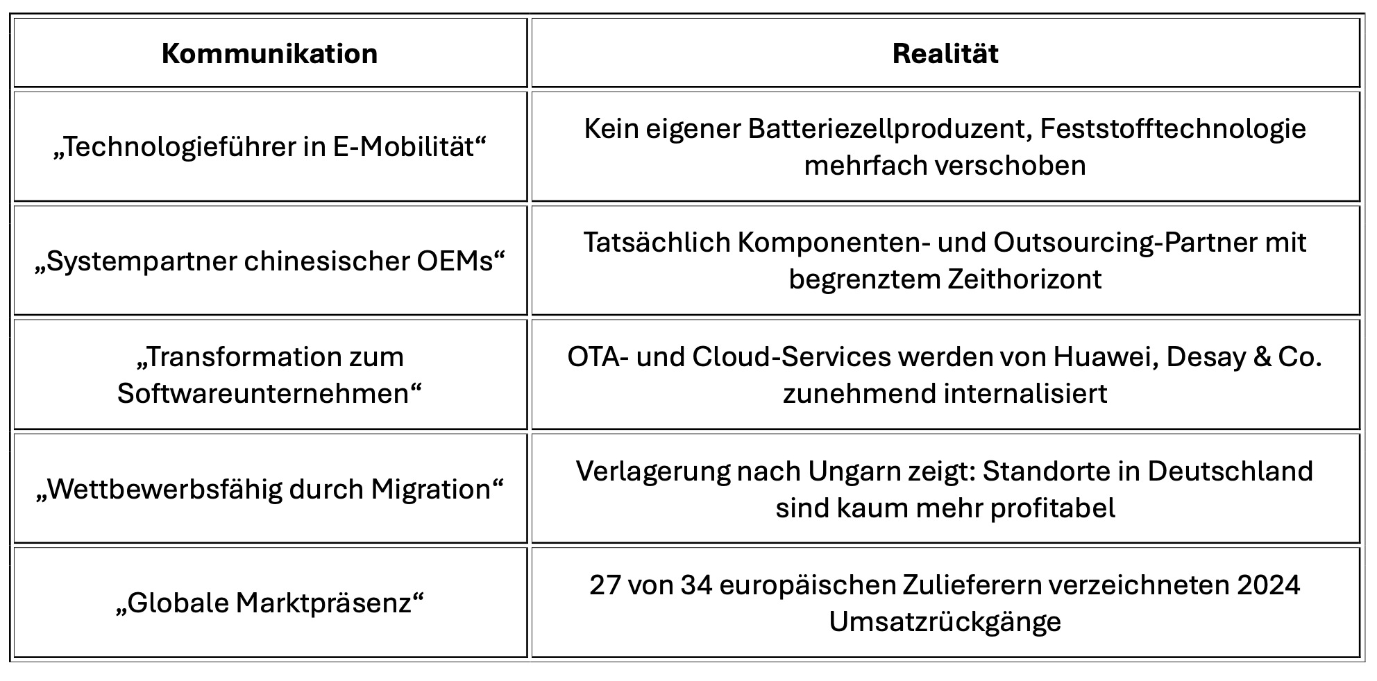 • Migration löst keine Strukturprobleme: Ungarn senkt Kosten, aber nicht das Grundproblem – chinesische Konkurrenz hat Skala + Integration + Staatsunterstützung