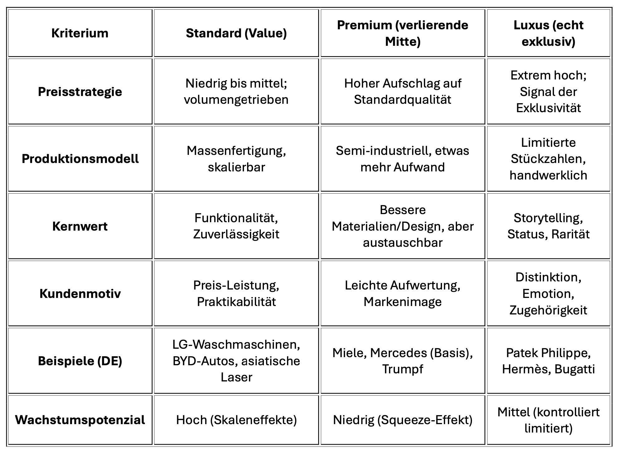 Die zentrale Erkenntnis: Die Mitte – das alte Premium – verliert ihren Daseinszweck, weil Standard nach oben aufschließt und Luxus nach unten bewusst kaum Raum lässt.