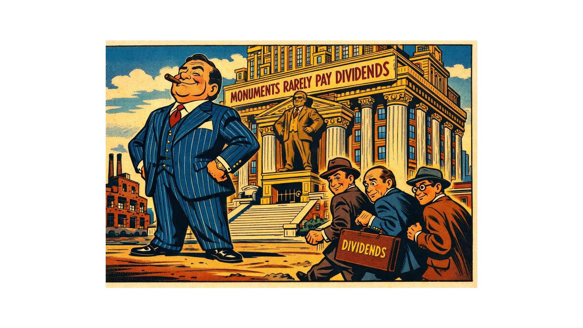 Als Thomas W. Phelps 1972 sein Buch 100 to 1 in the Stock Market schrieb, verwies er auf eine Broschüre, die bereits damals mehr als 35 Jahre alt war: Monuments Rarely Pay Dividends der Investmentfirma Scudder, Stevens & Clark – entstanden also irgendwann in den späten 1930er Jahren. Die Botschaft war lakonisch: Sobald ein Unternehmen anfängt, imposant zu werden, ziehen sich kluge Investoren zurück. Denn Denkmäler – prächtige Konzernzentralen, millionenschwere Prestigeprojekte, aufgeblähte Repräsentationsarchitektur – schütten keine Dividenden aus. Sie absorbieren sie.