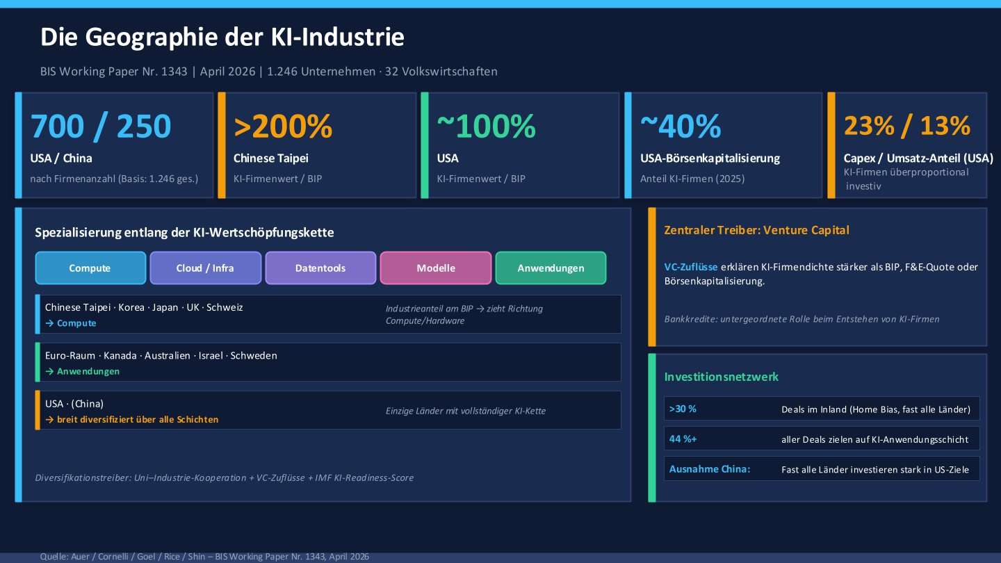 Wer glaubte, die KI-Revolution verteile ihre Früchte gleichmäßig über den Globus, wird durch ein neues BIS-Arbeitspapier nüchtern gestimmt. Die Studie The geography of AI firms (BIS Working Paper Nr. 1343, April 2026) kartiert erstmals systematisch, wo KI-produzierende Unternehmen tatsächlich sitzen, welches wirtschaftliche Gewicht sie tragen und welche institutionellen Konstellationen ihre Entstehung begünstigen. Das Ergebnis ist kein Plädoyer für die eine oder andere Industriepolitik – es ist eine Bestandsaufnahme struktureller Realitäten, die unbequem sind, weil sie den Abstand zwischen strategischer Selbstwahrnehmung und messbarer Substanz sichtbar machen.
