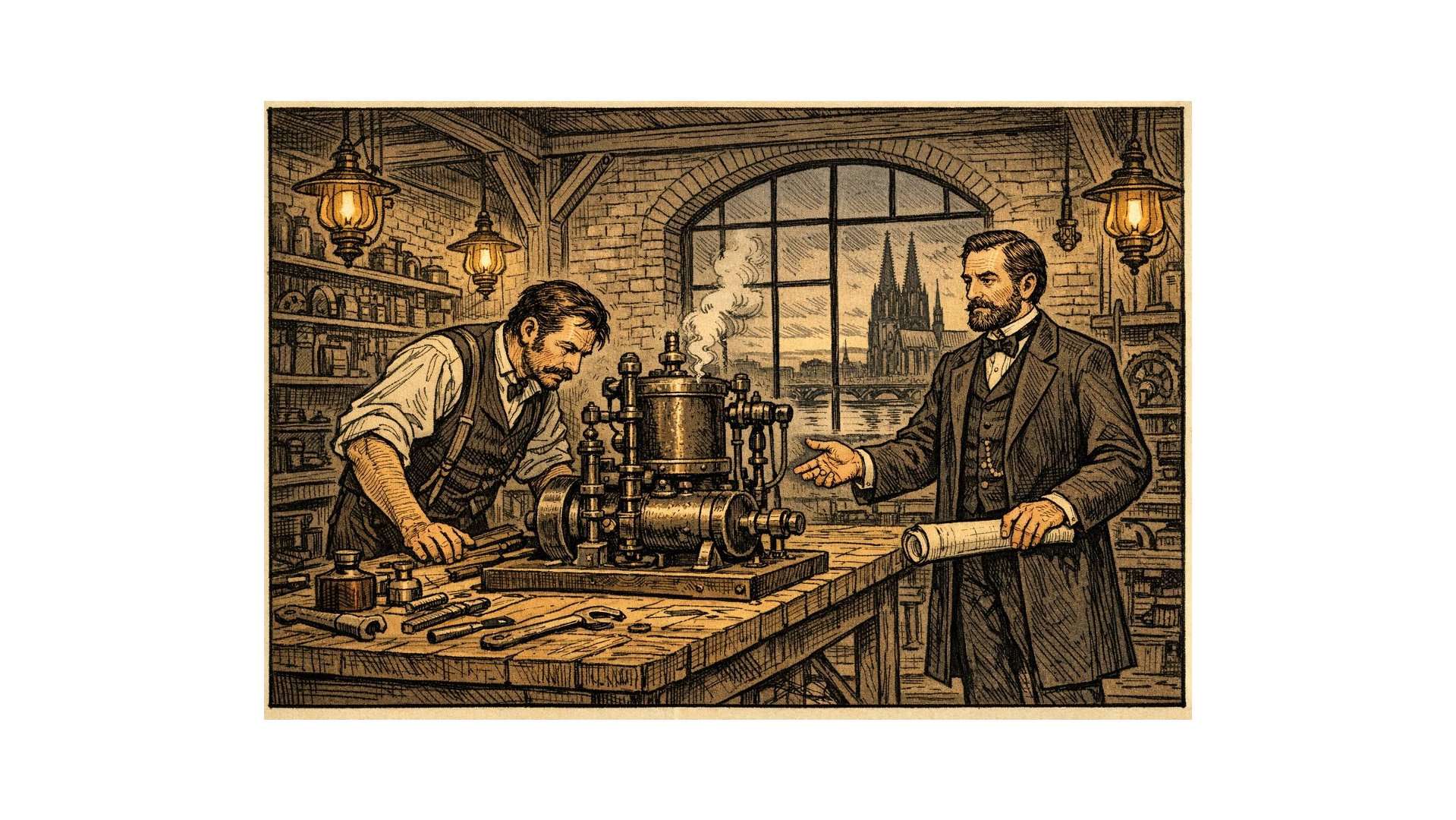 Als Nikolaus August Otto 1864 nach Köln kam, war er kein Akademiker, kein Ingenieur im Sinne der zeitgenössischen Standesordnung, sondern ein selbstgebildeter Tüftler mit einem klaren Konzept, aber ohne institutionellen Rückhalt. Er hatte Modelle und Überzeugungen – kein Kapital, kein Labor, keine Werkstatt. Langen wiederum besaß alles Organisationale, aber suchte ein Vorhaben, das des Einsatzes würdig war.