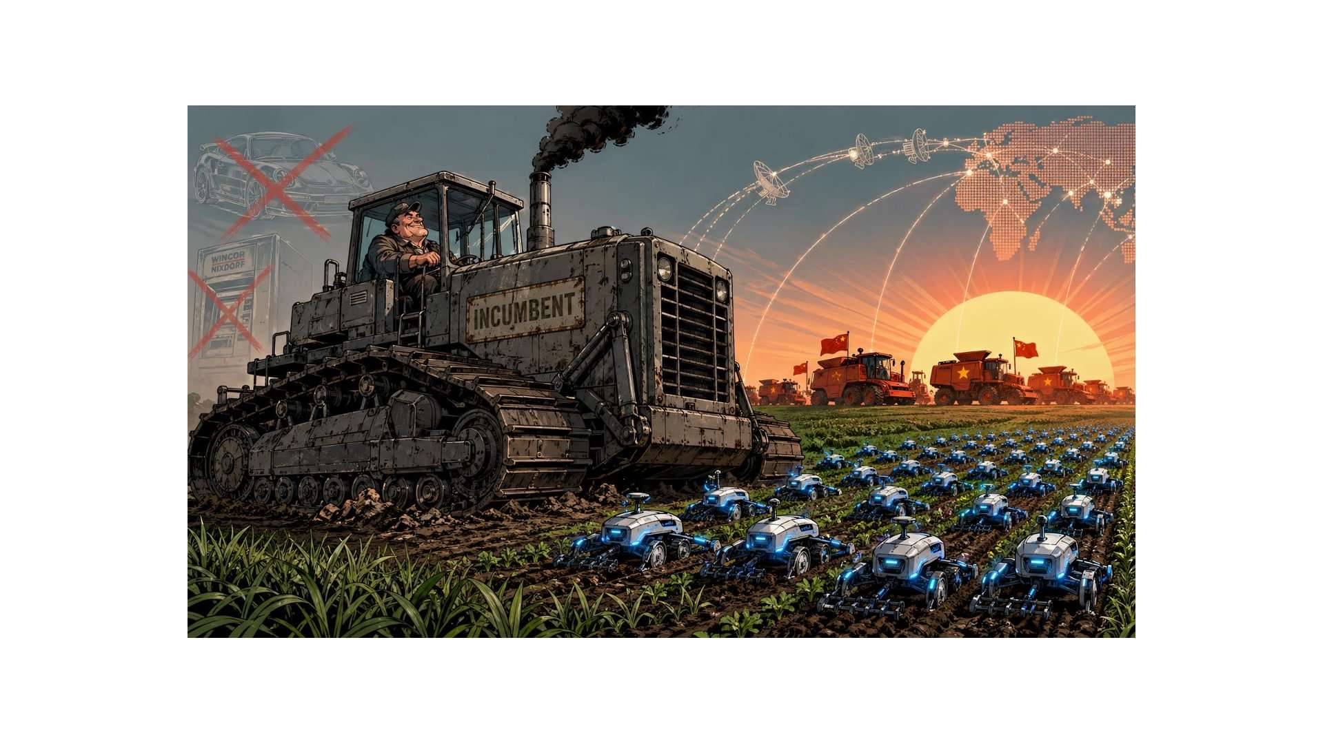 Der Schritt von „E-Autos taugen nichts“ zu „Elektro-Traktoren taugen nichts“ ist kein neues Argument. Es ist dieselbe Aussage in einem anderen Markt — von denselben institutionellen Reflexen produziert. Die Parallele zur deutschen Automobilindustrie ist keine Polemik, sondern Strukturdiagnose: Incumbents dominieren einen reifen Markt, eine neue Technologie erscheint zunächst begrenzt und verbessert sich dann rasch, die Etablierten erklären sie für ungeeignet — und meinen damit: ungeeignet für ihr Geschäftsmodell —, externe Akteure übernehmen das Segment, das die Incumbents freiwillig aufgegeben haben, und die Incumbents holen nicht mehr auf.
