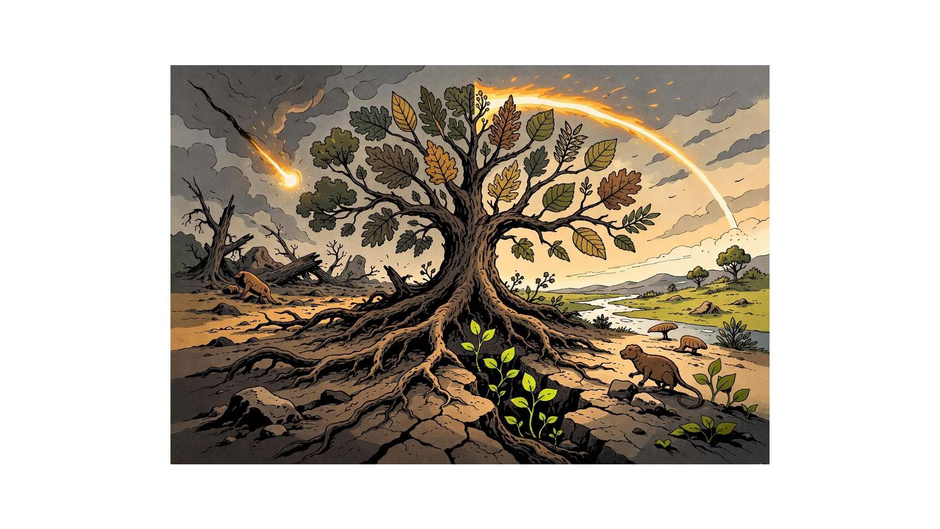 Hier liegt die schärfste Analogie – und die unbequemste. Gould hat immer wieder betont, dass hochspezialisierte Arten in stabilen Nischen zwar lokal dominant sind, aber in Massensterben-Ereignissen überproportional verletzlich werden. Es ist der Generalist – morphologisch unspektakulär, ökologisch flexibel, an mehrere Nischen angepasst –, der Katastrophen überlebt. Nicht weil er besser wäre, sondern weil er nicht vollständig von einem einzigen ökologischen Setting abhängt.