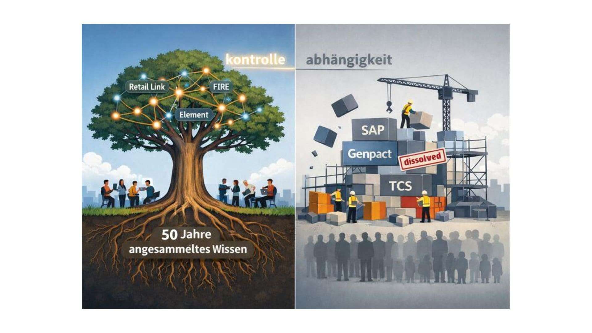 Aldi Süd investiert Hunderte Millionen in SAP-Software und mobilisiert über 1.000 Expert:innen für das Projekt AHEAD. Gleichzeitig werden bis 2027 rund 500 Stellen in der Zentrale abgebaut – durch Zentralisierung nach Salzburg und Auslagerung nach Indien. Am 14. Mai 2025 wurde die Projektgesellschaft in die ALDI International Services überführt – eine Organisation mit 3.000 Mitarbeitern, die nun die SAP-Wartung übernimmt, aber bei globalen Prozessen von Genpact abhängig bleibt. Walmart hingegen betreibt seit 50 Jahren tausende eigene Entwickler, die kontinuierlich weiterentwickeln statt nur warten. Der Unterschied zwischen Betrieb und strategischer Kontrolle könnte entscheidend sein.